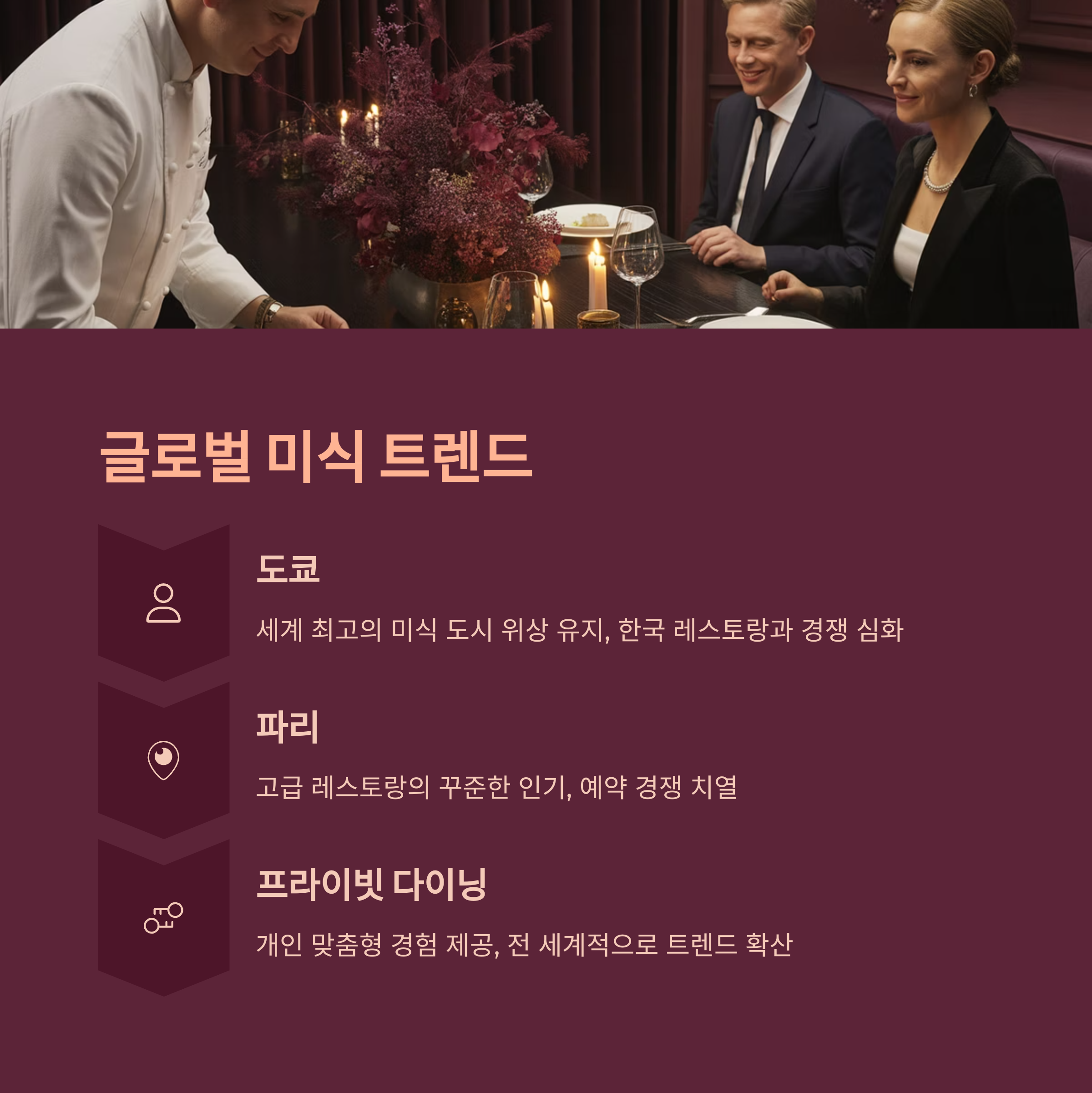 미식 경험은 단순한 식사 그 이상으로, 다양한 라이프스타일과 문화적 흐름을 반영하고 있어요. 최근에는 프라이빗룸, 셰프 테이블, 숙박을 결합한 특별한 다이닝 경험들이 주목받고 있습니다. 그리고 주목해야 할 트렌드 중 하나는 호텔 내 미식 컨셉의 테이스팅 코스가 대세라는 것이죠. 이런 코스에서는 특히 사계절 제철 식재료를 중시하며, 개별 셰프의 창의력이 돋보이는 요리들이 제공됩니다. 이러한 변화는 단순한 소비자 경험을 넘어서 개인화된 럭셔리 경험이라는 새로운 기준을 만들어 내고 있습니다.