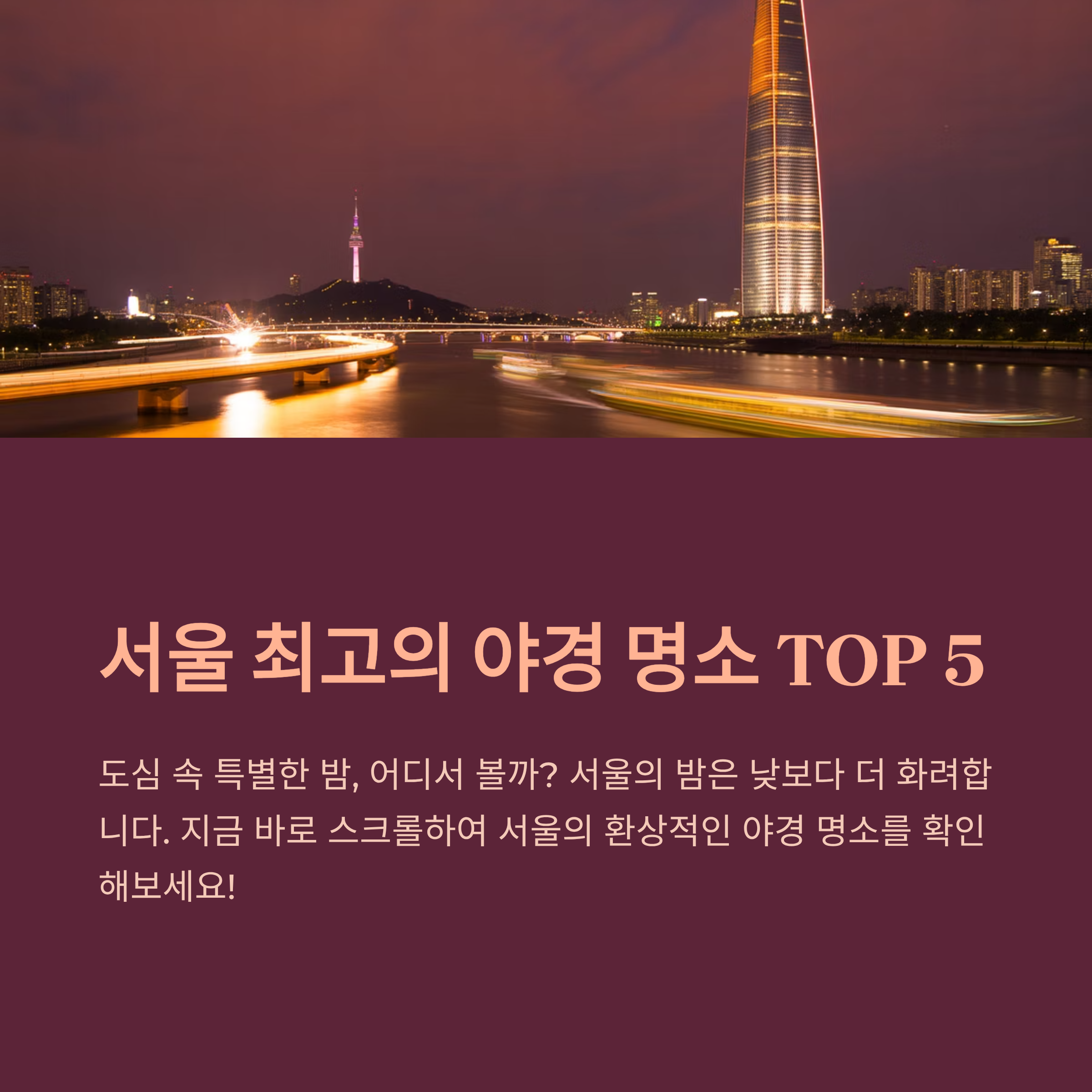 서울의 화려한 야경을 바라보며 하루를 마무리할 기회를 놓치지 마세요. 길위에 나를 두다 블로그의 이번 포스트는 서울의 필수 야경 명소를 소개합니다. 서울의 밤하늘을 장식하는 불빛들은 하루의 스트레스를 날려줄 특별한 경험이 될 것입니다. 지금 바로 함께 떠나볼까요?