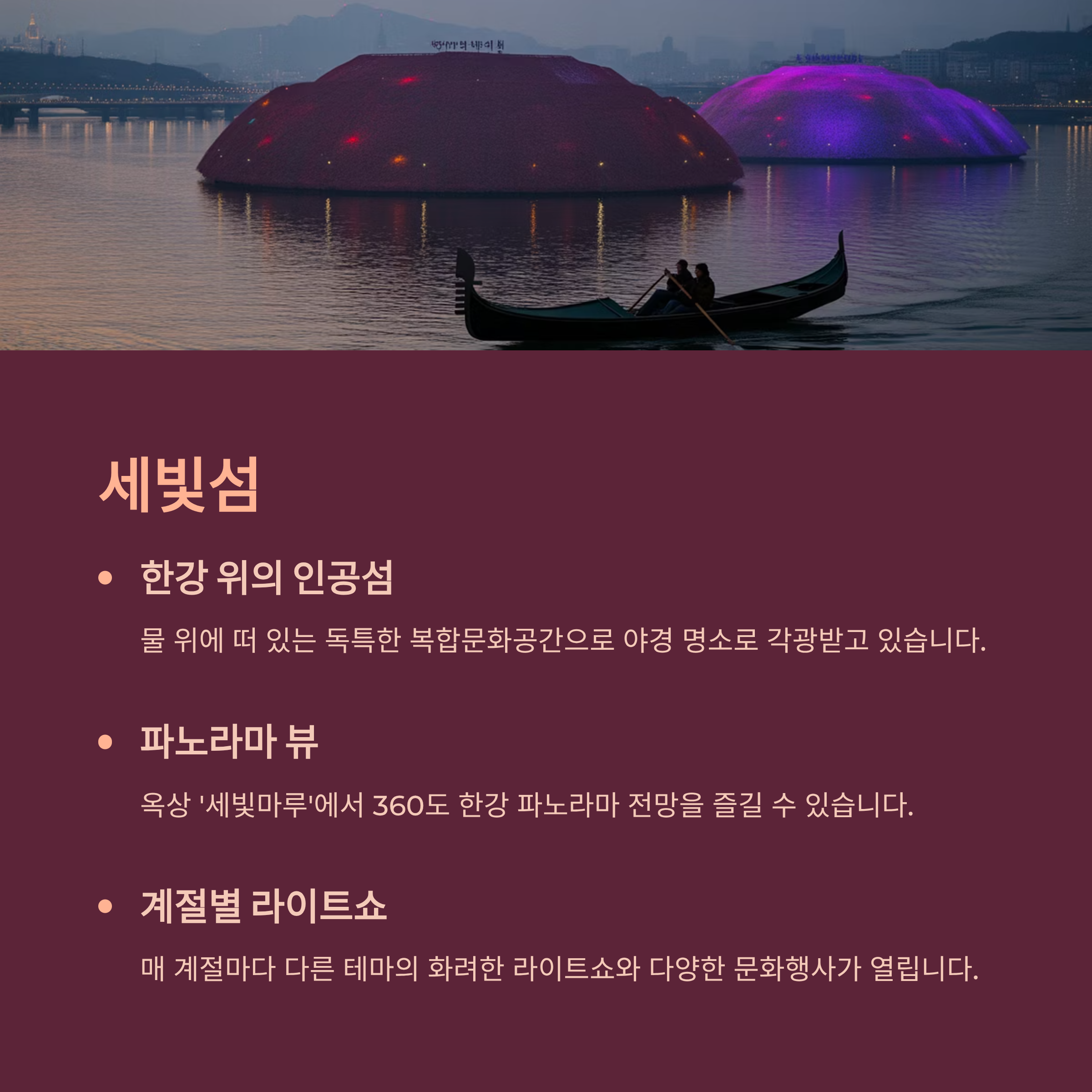 세빛섬은 한강을 따라 서울의 현대적인 야경을 즐기기에 최적의 장소로, 가빛섬, 채빛섬, 솔빛섬 세 곳으로 이루어졌습니다. Floating Islands라는 별명답게 물 위에 떠 있는 듯한 독특한 구조와 예빛의 화려한 미디어아트쇼가 특별한 경험을 선사합니다. 서울시가 선정한 패밀리 및 커플들이 찾는 야경 성지로도 유명하지요. 이번 표에서는 세빛섬의 주요 행사와 방문 정보를 함께 알아볼까요?