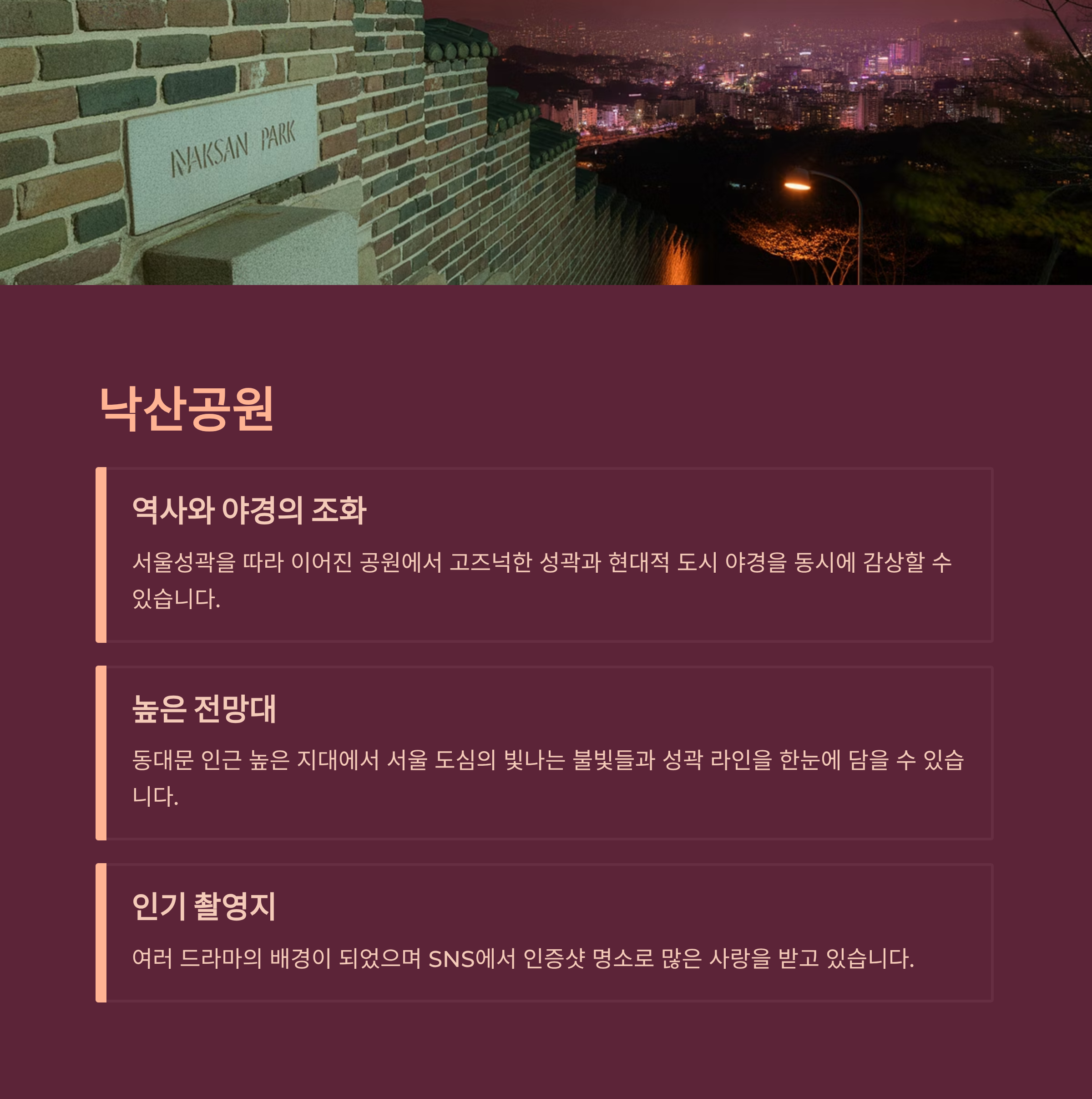 낙산공원은 서울 한복판에서 서울 성곽길과 함께 환상적인 야경을 제공하는 명소입니다. 특히, 지역마다 색다른 매력을 느낄 수 있는 성곽의 라인은 긴장감과 동시에 평화를 느끼게 해주지요. 트립닷컴 실시간 인기 1위를 차지한 이곳에서는 당신의 사진작가 감성을 마음껏 발휘할 수 있습니다. 이제 낙산공원에서 놓치지 말아야 할 포인트들을 알아볼까요?