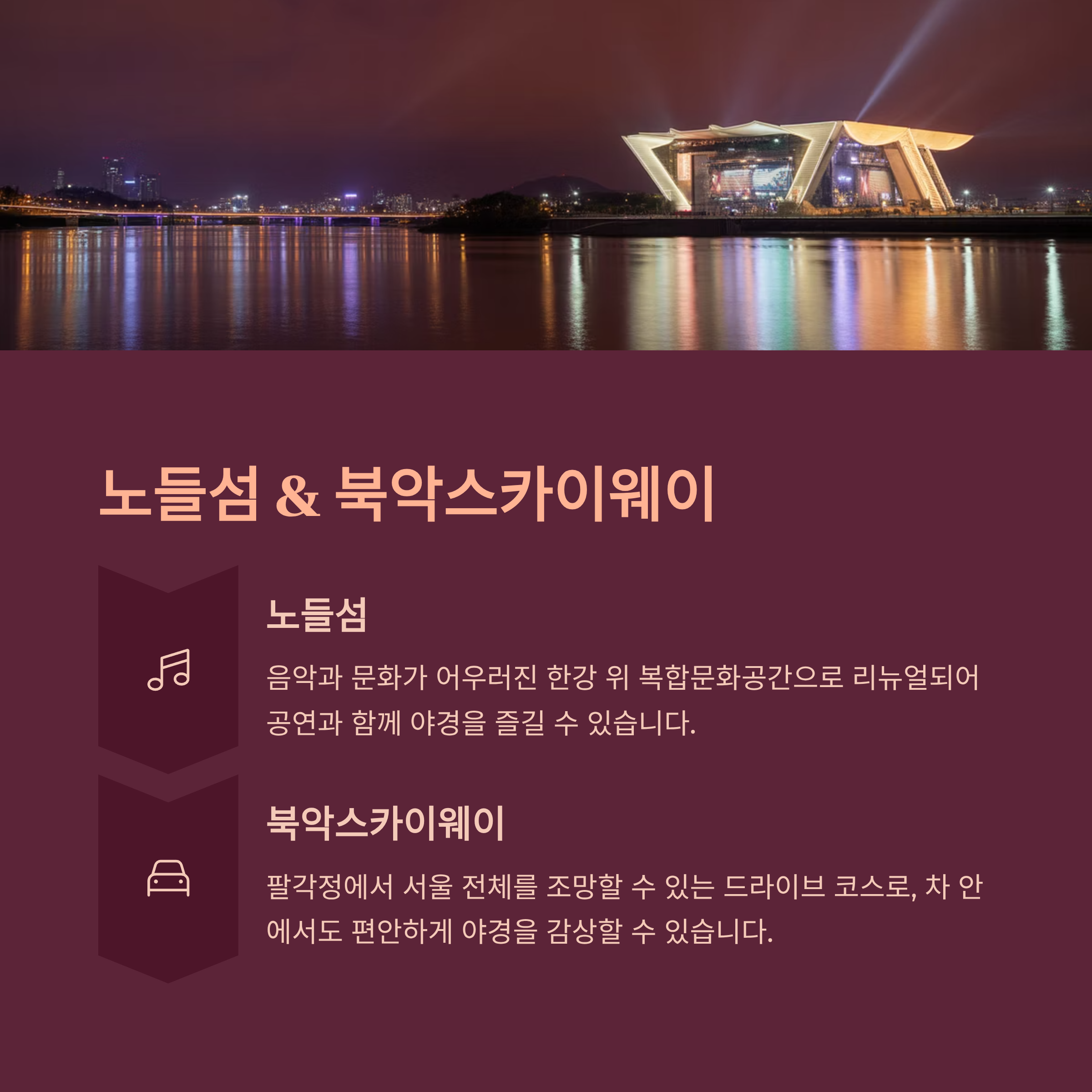 북악스카이웨이 팔각정은 드라이버와 자전거 애호가 모두에게 사랑받는 드라이브 코스입니다. 이곳에 오르면 서울 도심과 강북, 한강 전경은 물론 서울숲과 같은 명소의 야경을 한눈에 담을 수 있어요. 팔각정에서 전망대까지는 다양한 전망 포인트가 있어 마치 자연 속의 도시 여행을 떠나는 느낌입니다🚗. 이곳을 방문하면 드라이브의 피로도 야경의 장엄함 덕분에 말끔히 풀리게 됩니다. 이제, 이곳을 방문할 때 알면 좋은 정보들을 표로 알아보아요.