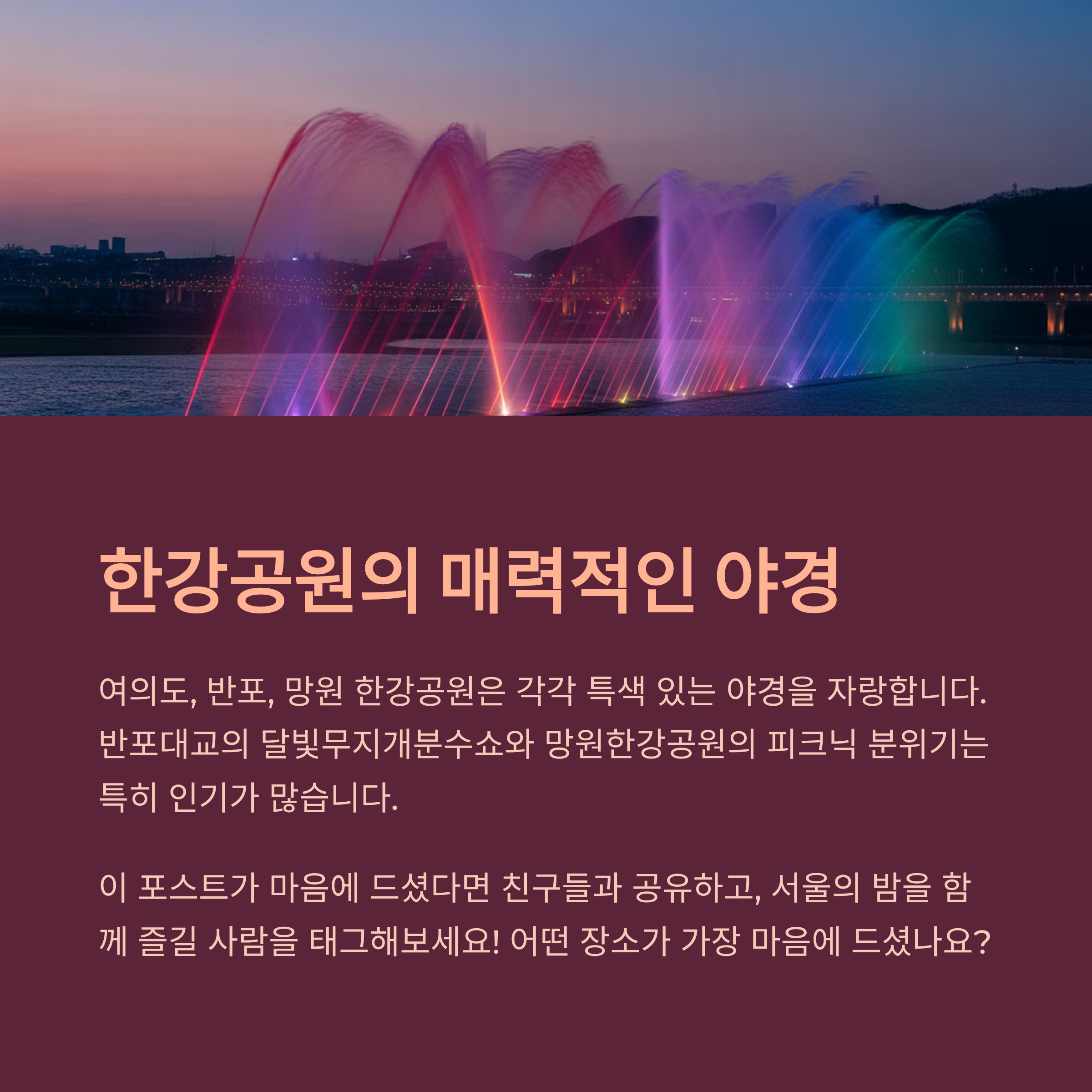 한강 시민공원은 서울의 야경을 보다 가까이에서 경험하기에 이상적인 장소입니다. 다양한 활동과 감성이 교차되는 이곳에서는 친구나 가족과 함께 특별한 시간을 보낼 수 있습니다. 야경을 즐기기에 가장 좋은 포인트를 소개합니다.🌙