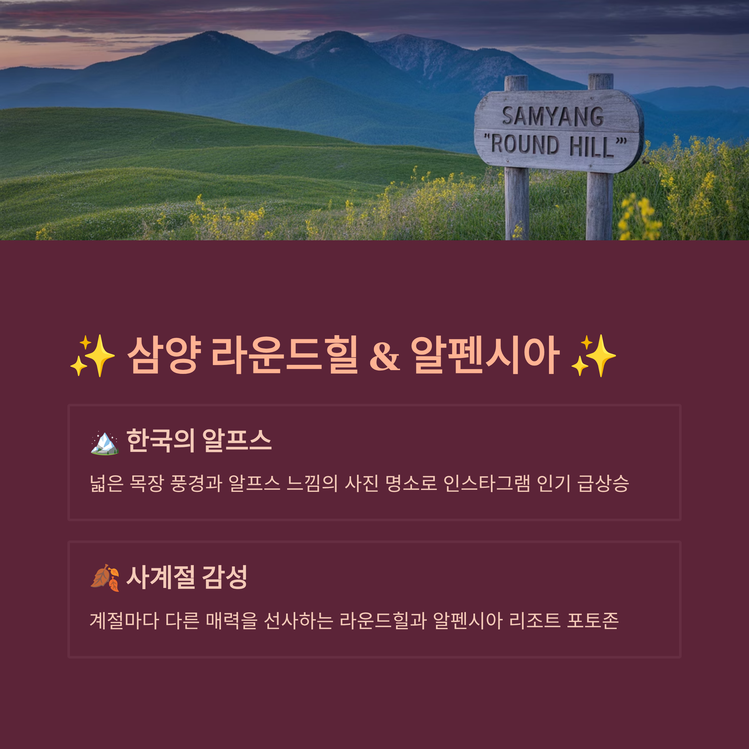 강원도 평창에 위치한 삼양 라운드힐과 알펜시아 리조트는 사계절 내내 감성적인 풍경을 즐기기에 완벽한 장소입니다. 특히 삼양 라운드힐은 드넓은 목장 풍경과 더불어, 인스타그램에서 61,000회 이상의 포스팅으로 감성 사진 명소로 손꼽힙니다. 📸 또한, 알펜시아 리조트는 다양한 야외 활동을 즐길 수 있어 많은 방문객들에게 인기를 끌고 있어요. 여행을 계획하면서 참고할 수 있는 체크리스트 및 가이드를 아래에 제공했습니다.