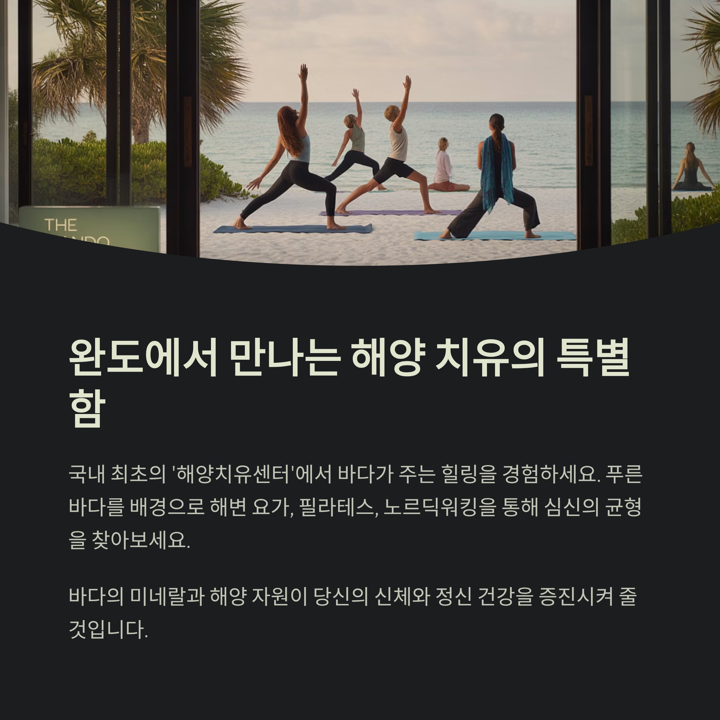 전라남도 완도에 위치한 완도왔섬은 해양 자원을 활용한 치유 프로그램으로 유명해요. 해수와 해조류를 기반으로 한 치료 프로그램과 가족 중심의 키즈월드가 큰 인기를 끌고 있다니, 완전 가족여행지로 딱이죠! 👪 특히 특산물 체험이 아주 재미있다고 해요. 장보고수산물축제 기간에는 하루에도