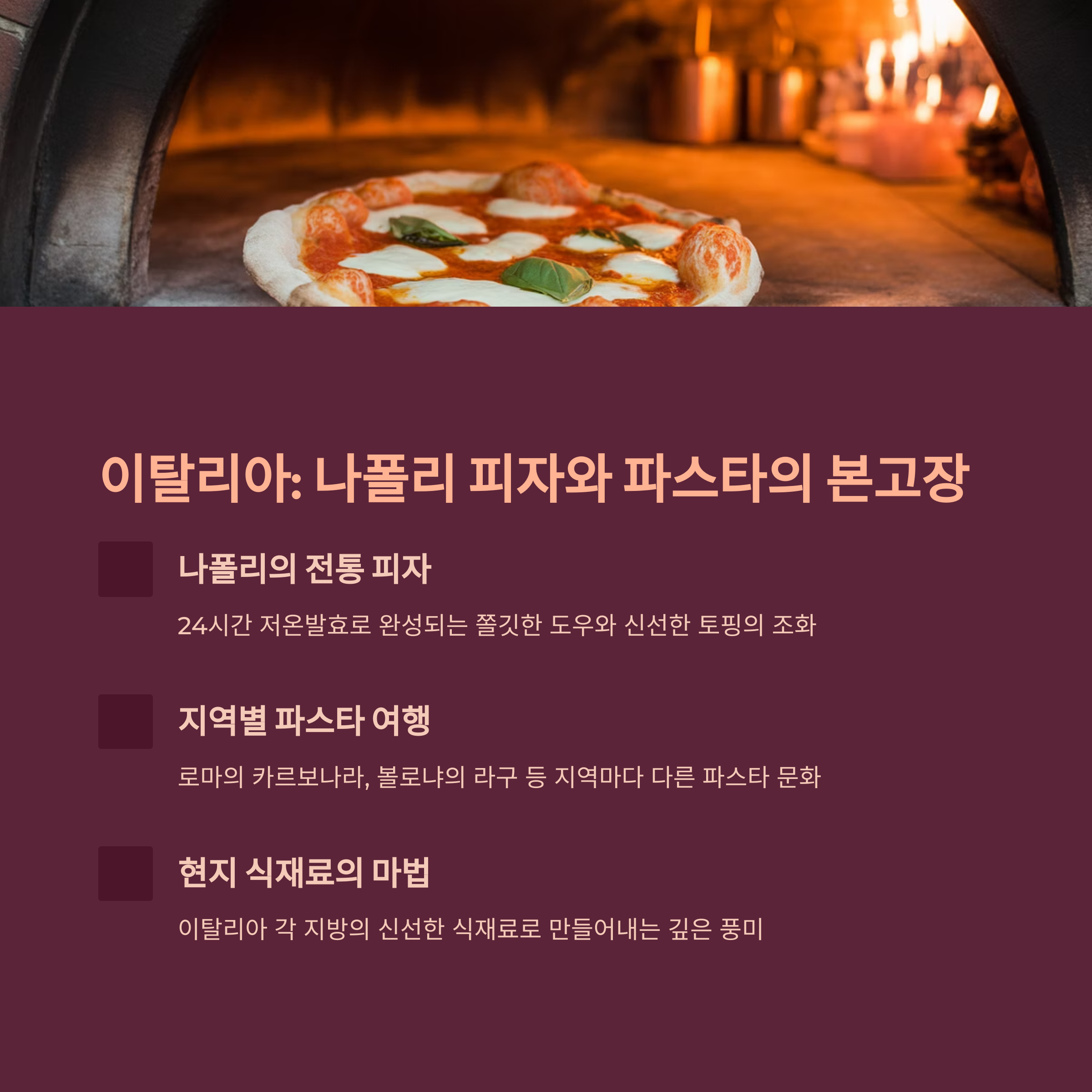 이탈리아의 나폴리와 로마는 각각 이탈리아 요리의 중심지로, 다양한 피자와 파스타를 맛볼 수 있는 환상적인 여행지입니다. 나폴리는 전통 나폴리 피자의 본고장으로, 매년 피자 축제와 미식 투어로 관광객들을 끌어모으고 있습니다. 반면 로마는 카르보나라와 같은 클래식 파스타 요리를 중심으로 관광객들에게 다채로운 미식 경험을 선사합니다. 이러한 이탈리아 요리의 매력을 깊이 이해하고 싶다면, 두 도시를 탐방하며 다양한 미식 문화를 체험해보세요.