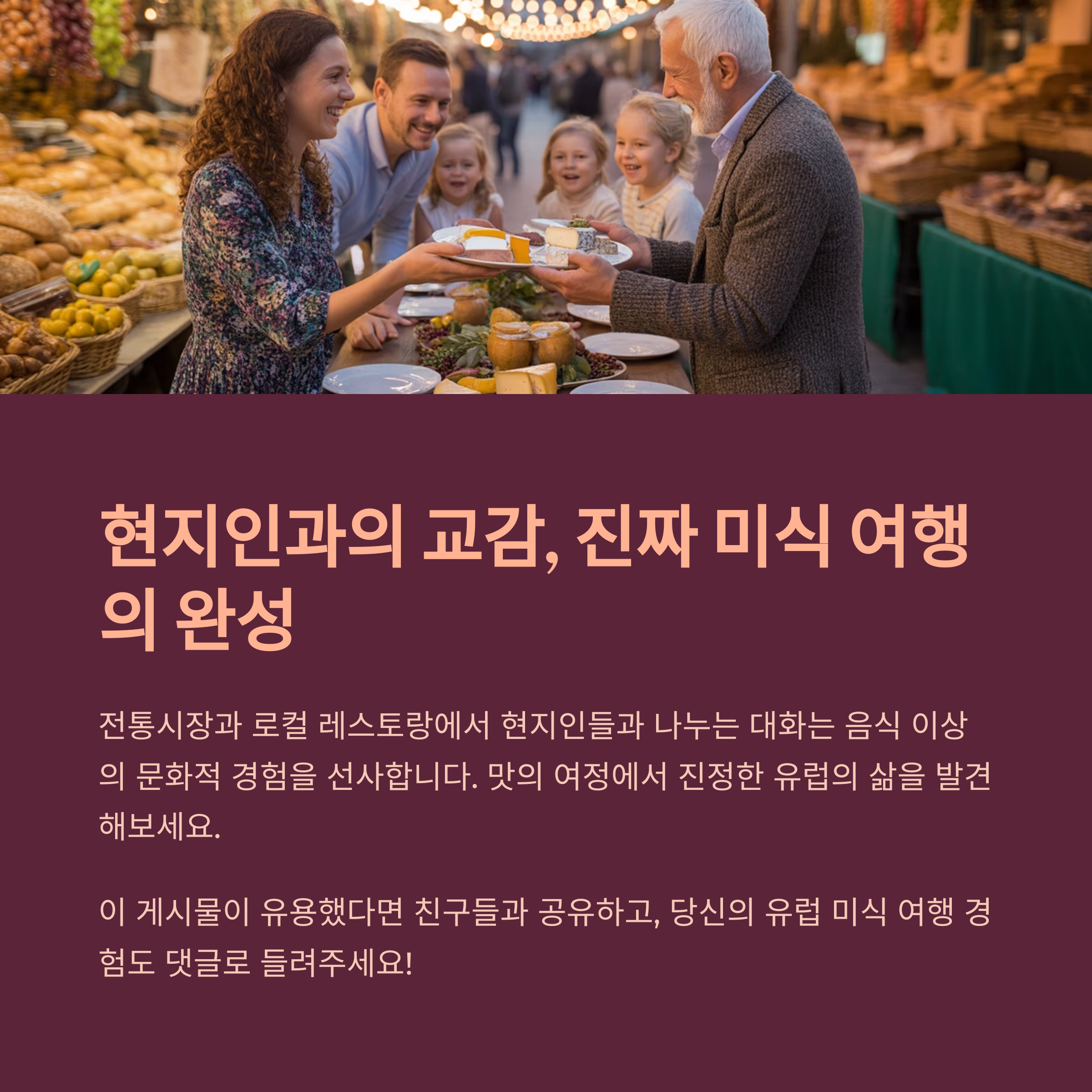 유럽 미식 여행은 단순한 음식 여행을 넘어 그 나라의 문화와 전통을 이해하고 즐길 수 있는 특별한 기회입니다. 각 지역의 고유한 음식과 도시의 매력을 체험하면서, 유럽의 다양한 문화를 한층 더 깊이 경험할 수 있습니다. 리옹의 부숑 요리, 보르도의 와인, 그리고 루체른의 치즈는 각자 다른 매력으로 여행자들의 기억에 남을 것입니다. 이제 남은 것은 직접 현지로 떠나는 것입니다. 여행 계획을 세우고, 자신만의 유럽 미식 여행을 준비해 보세요. 여러분의 취향에 맞는 도시와 맛을 찾아가는 과정을 통해, 더욱 풍성한 여행이 될 것입니다. 유럽에서의 미식 여행이 여러분에게 색다른 즐거움과 소중한 추억이 되길 바랍니다.